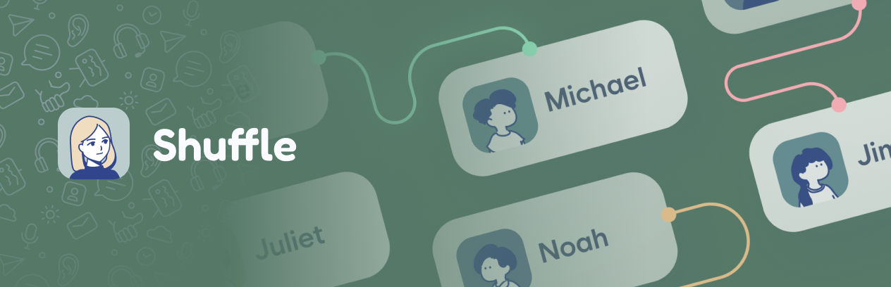 **Shuffle**은 팀원 간 1:1 연결을 자연스럽게 유도하여, 보다 활기차고 참여도 높은 업무 환경을 조성합니다. 각 세션에서는 두 명의 팀원이 무작위로 매칭되어 짧고 재미있는 챌린지를 함께 수행합니다! 🚀